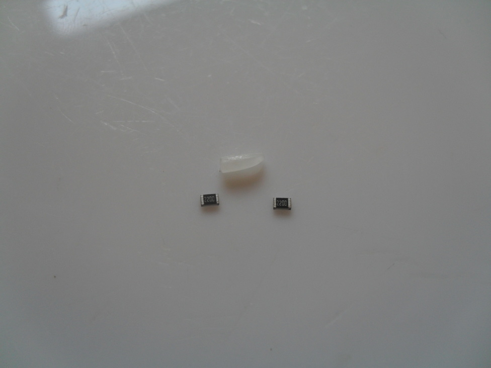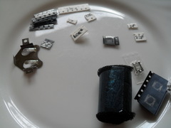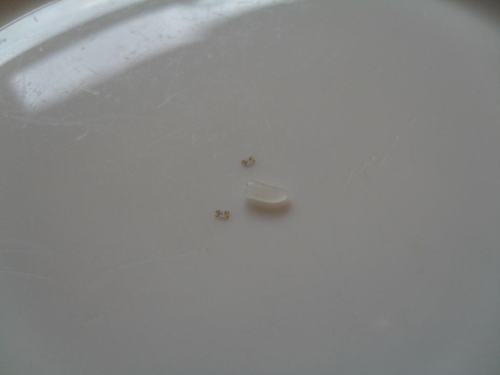 The components needed to build a prototype device by hand, grain of rice for scale: